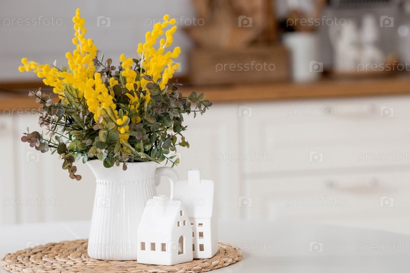 Букет мимозы на белом столе. На заднем плане интерьер белой кухни в скандинавском стиле. Понятие домашнего уюта. Концепция Международного женского дня 8 марта
