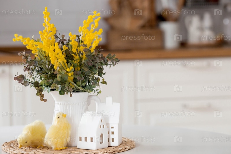 Букет мимозы на белом столе. На заднем плане интерьер белой кухни в скандинавском стиле. Понятие домашнего уюта. Концепция Международного женского дня 8 марта