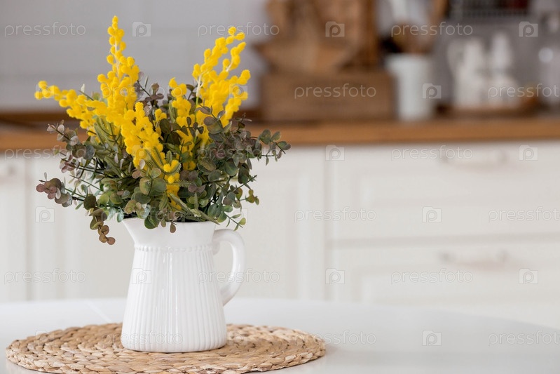 Букет мимозы на белом столе. На заднем плане интерьер белой кухни в скандинавском стиле. Понятие домашнего уюта. Концепция Международного женского дня 8 марта