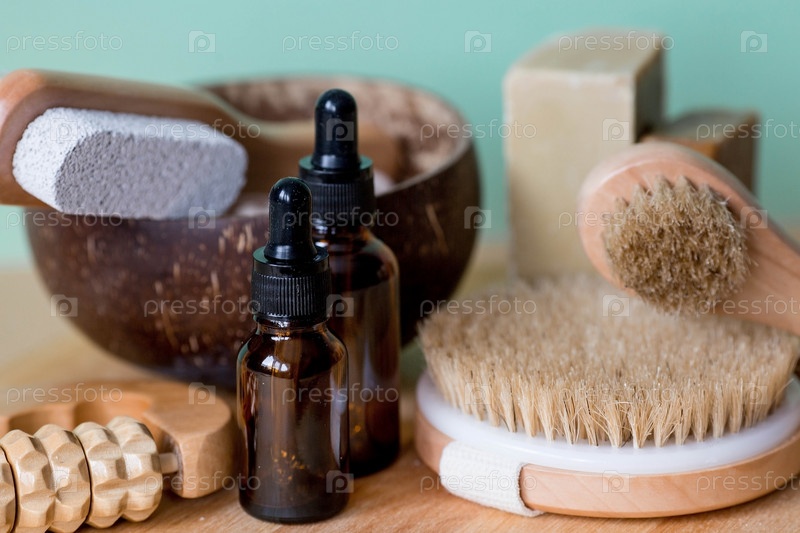 Ароматерапия. Стеклянная бутылка с пипеткой для масла, лосьона, крема, массажных щеток и банных принадлежностей. Натуральная органическая экокосметика. Макет фирменного стиля салона красоты