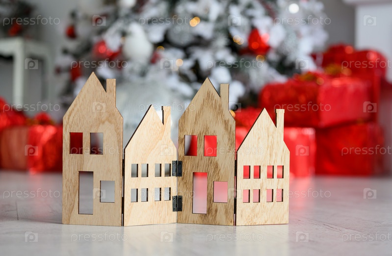Деревянные фигурки домов стоят на полу на фоне елки и подарков. Выборочная фокусировка