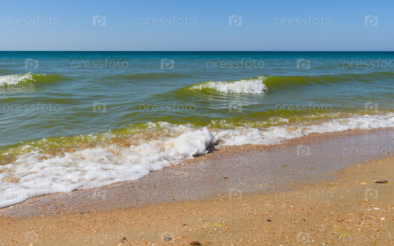 Грязное море с зелеными водорослями. Сезонное цветение морской воды