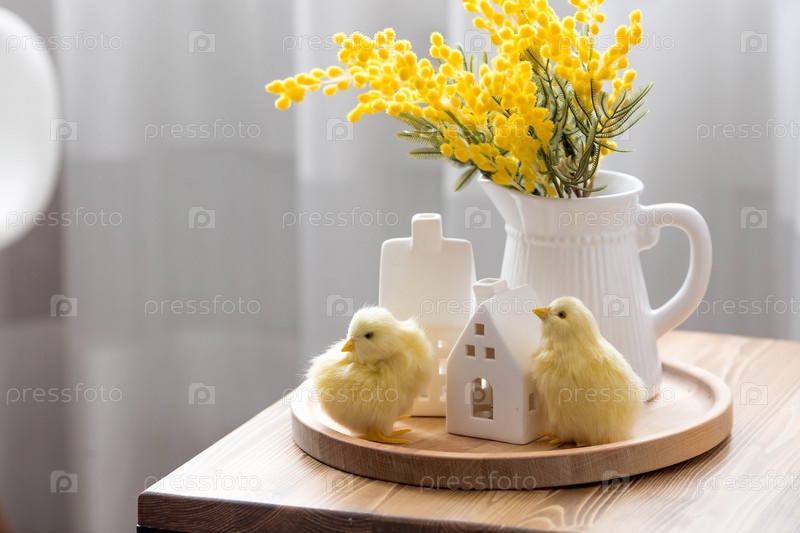 Букет мимозы на деревянном столе, цыплята и белые домики. Интерьер гостиной на заднем плане. Понятие домашнего уюта. Концепция весны в доме и Международного женского дня 8 марта
