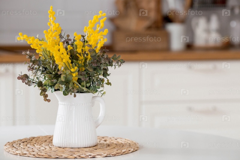Букет мимозы на белом столе. На заднем плане интерьер белой кухни в скандинавском стиле. Понятие домашнего уюта. Концепция Международного женского дня 8 марта