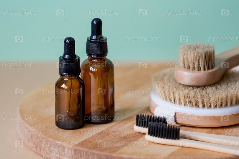 Ароматерапия. Стеклянная бутылка с пипеткой для масла, лосьона, крема, массажных щеток и банных принадлежностей. Натуральная органическая экокосметика. Макет фирменного стиля салона красоты