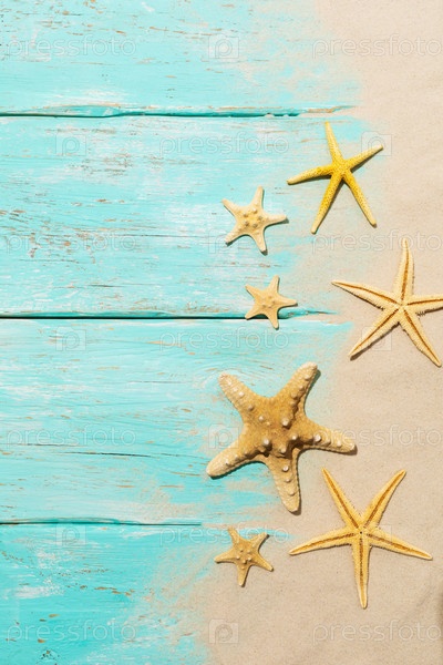 Морские звезды на голубом деревянном фоне с песком и копировальным пространством