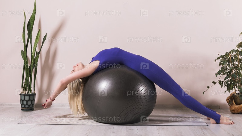 Привлекательная женщина в синей спортивной одежде занимается йогой, выполняет позу моста, бандхасану на фитболе в комнате у стены