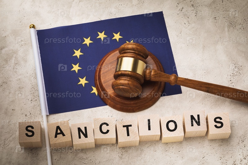 Деревянные кубики с текстом, судебный молоток и флаг ЕС, концепция на предмет введенных санкций со стороны Европейского Союза