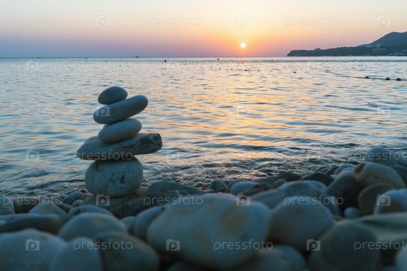 Красивый закат на море и балансирующая пирамида из камней