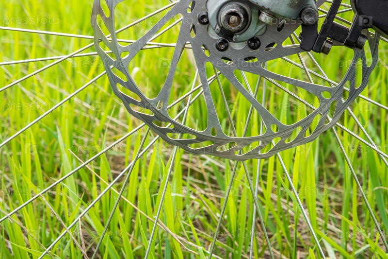 Вид сбоку на спицы и тормозной диск горного велосипеда на фоне зеленой травы
