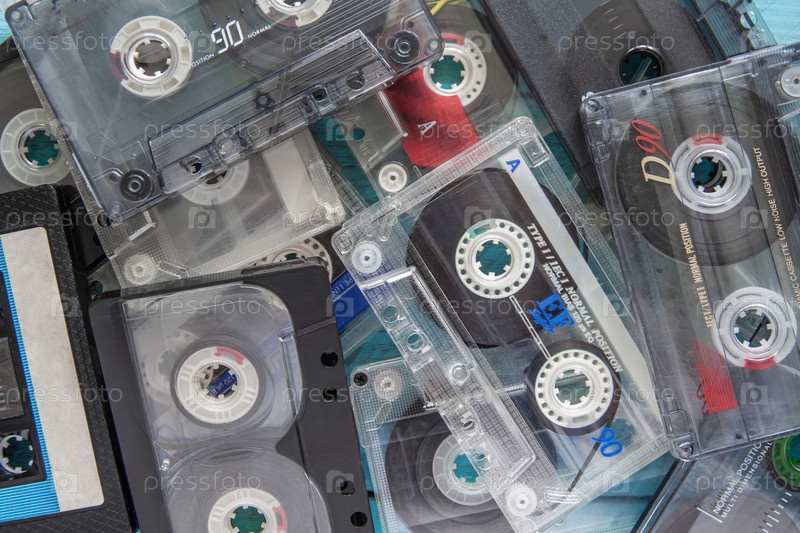 Краснодар, Россия - 11 марта 2021 года: россыпь аудиокассет на синем деревянном фоне. Крупный план. Изображение на заднем плане
