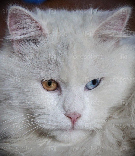 Портрет белого пушистого кота с разноцветными глазами, синими и оранжевыми