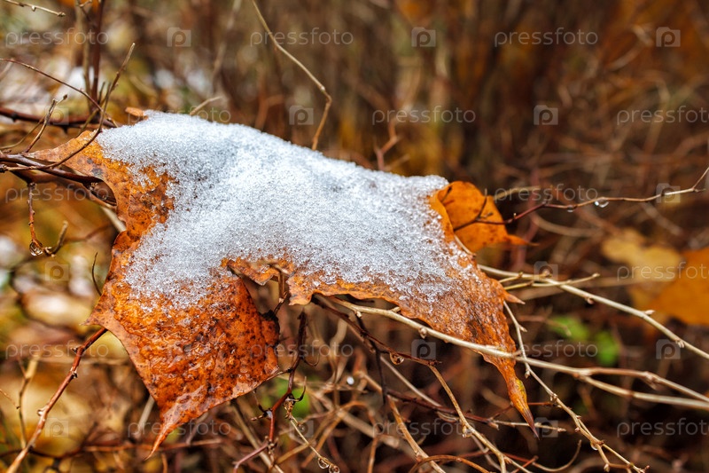Желтый кленовый лист, покрытый снегом