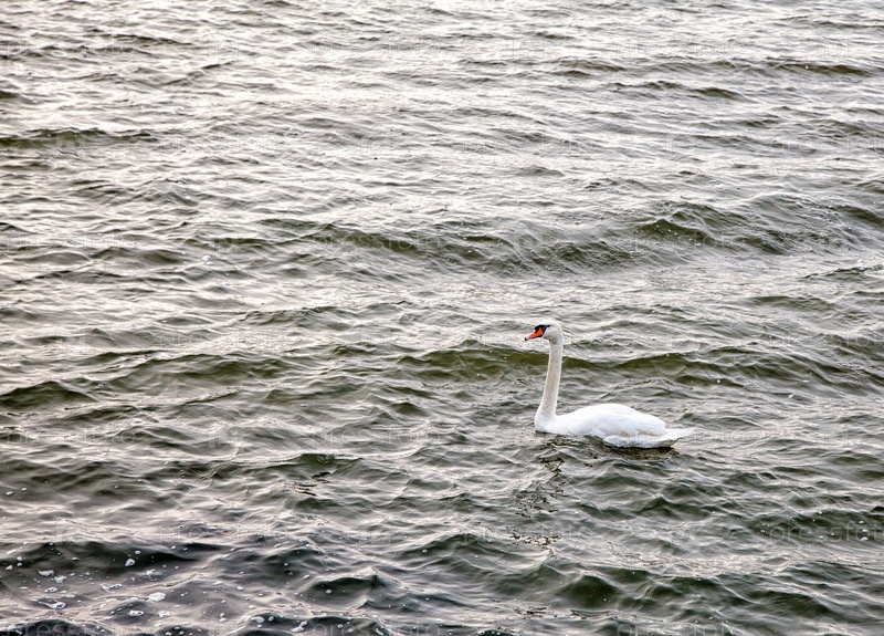 Белый лебедь плывет по озеру осенью