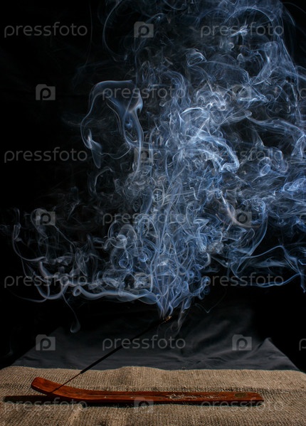 Индийская ароматическая палочка с дымом на черном фоне в помещении крупным планом