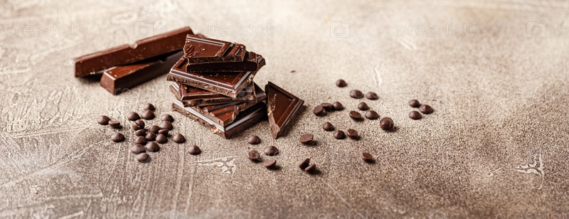 Кусочки темного шоколада с шоколадной крошкой на коричневом фоне крупным планом. Место для текста. Длинный широкий баннер