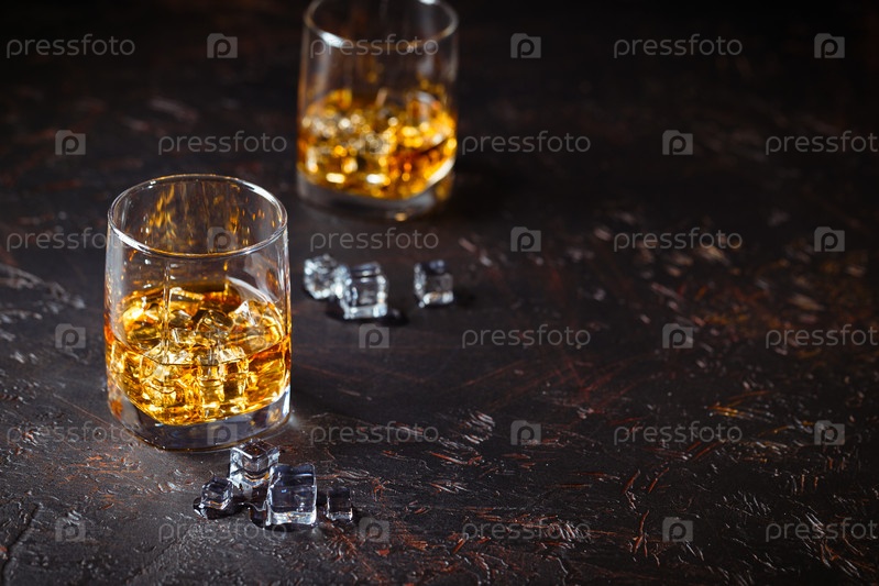 Два стакана виски со льдом на темном фоне с отражением. Алкогольный напиток. Место для текста