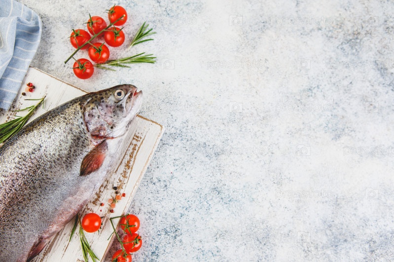 Свежая радужная сырая форель с розмарином, помидорами, перцем, оливковым маслом, гималайской солью и лимоном на светлом фоне. Здоровая пища. Концепция приготовления пищи. Вид сверху, место для текста