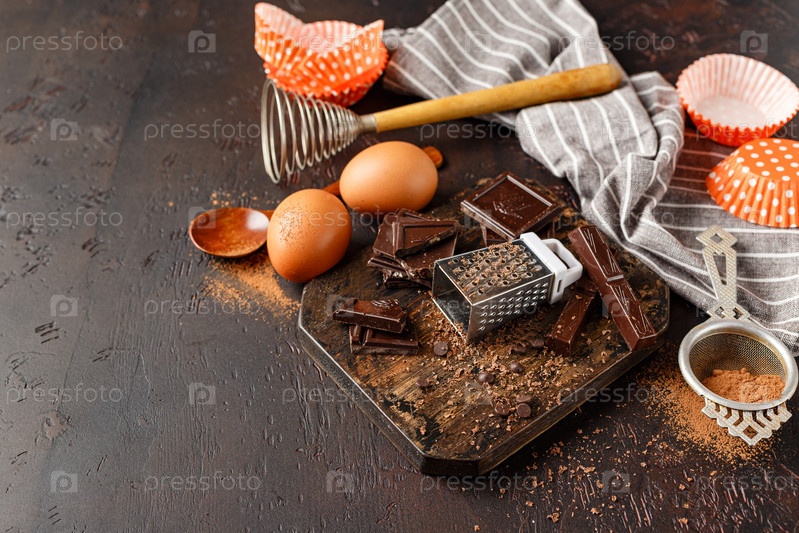Шоколадные ингредиенты для выпечки, кусочки шоколада, шоколадная стружка, какао-порошок и яйца на деревянной разделочной доске на темном столе. Место для текста
