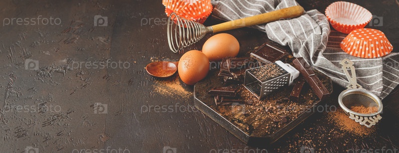 Шоколадные ингредиенты для выпечки, кусочки шоколада, шоколадная стружка, какао-порошок и яйца на деревянной разделочной доске на темном столе. Место для текста. Длинный широкий баннер