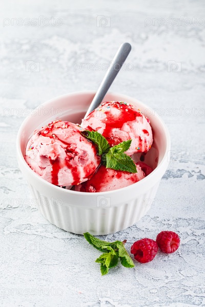 Шарики малинового мороженого с сиропом, ягодами и листьями мяты в белой миске