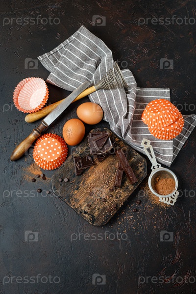 Шоколадные ингредиенты для выпечки, кусочки шоколада, шоколадная стружка, какао-порошок и яйца на деревянной разделочной доске на темном столе. Вид сверху