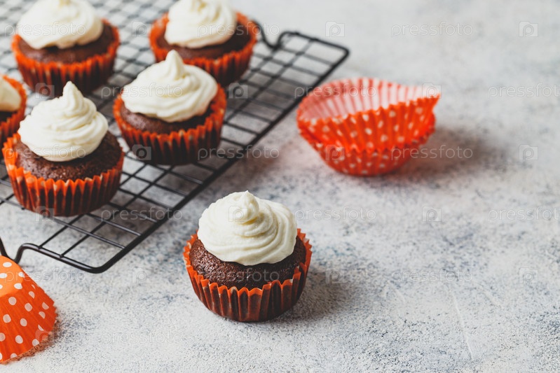 Шоколадные кексы с крышкой сырного крема в банках из оранжевой бумаги на металлической сетке на светлом фоне