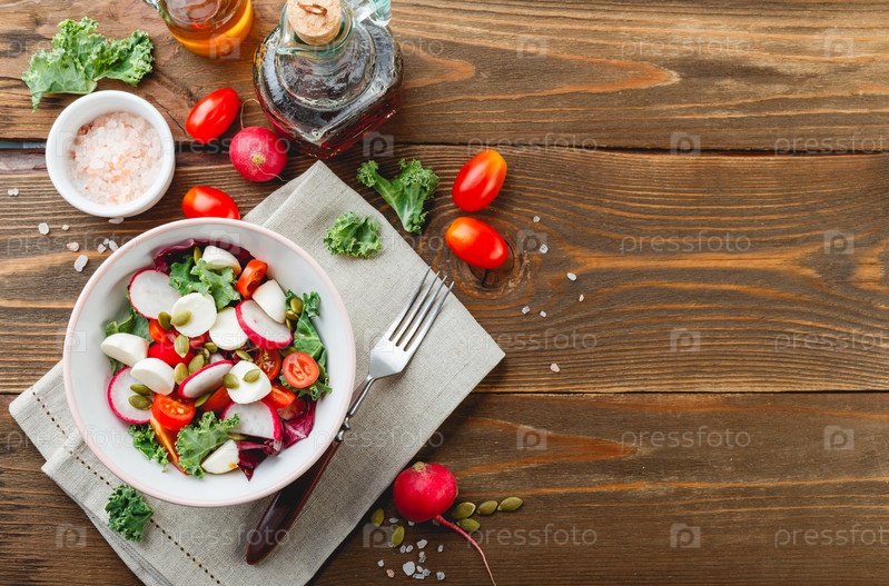 Салат из салата айсберг, капусты и радиччио, помидоры черри, редис, мини-моцарелла и тыквенные семечки в мисках на темном деревянном фоне. Вид сверху. Место для текста