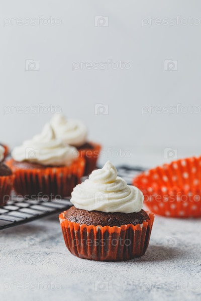Шоколадные кексы с крышкой сырного крема в банках из оранжевой бумаги на металлической сетке на светлом фоне