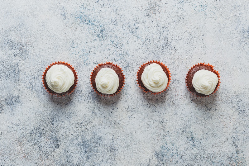 Шоколадные кексы с шапкой сырного крема в оранжевых бумажных банках на светлом фоне
