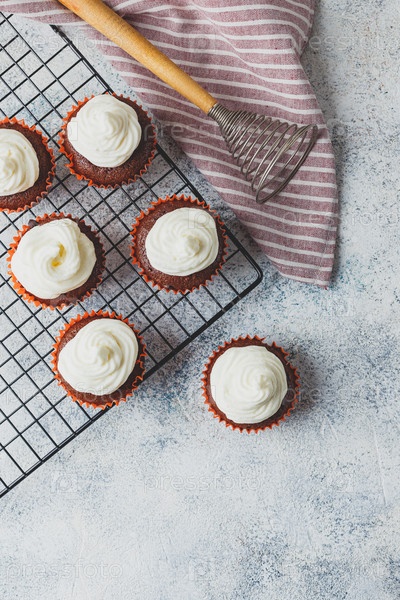 Шоколадные кексы с крышкой сырного крема в банках из оранжевой бумаги на металлической сетке на светлом фоне