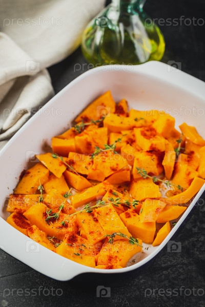 Сырая тыква, нарезанная небольшими кусочками с тимьяном в форме для выпечки на деревянном фоне