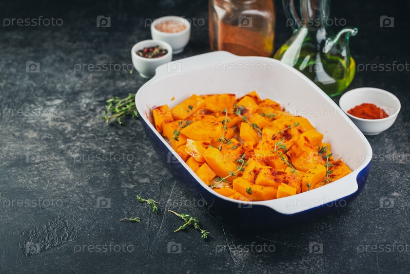 Сырая тыква, нарезанная небольшими кусочками с тимьяном в форме для выпечки на деревянном фоне