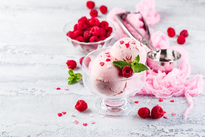 Шарики малинового мороженого с ягодами и листьями мяты в миске
