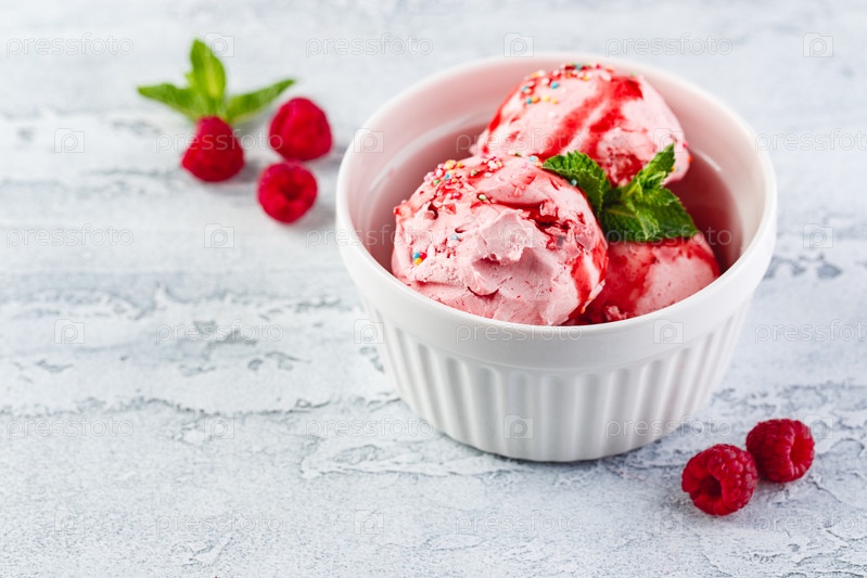 Шарики малинового мороженого с сиропом, ягодами и листьями мяты в белой миске