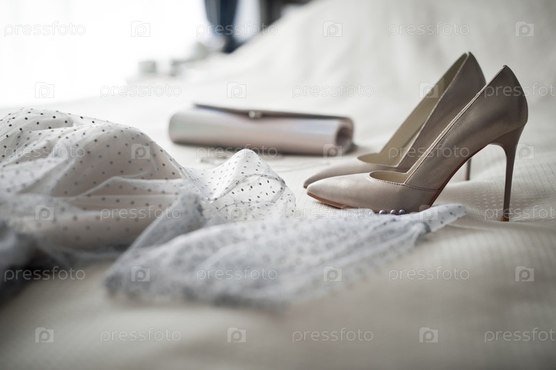 Бежевые туфли и серьги с колье на кровать 2830