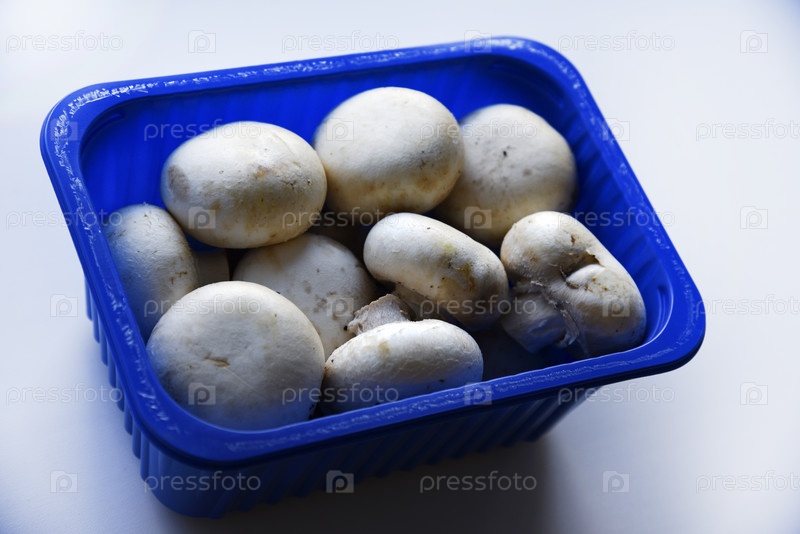 Большие белые грибы в синем контейнере на белом фоне. Красивые грибы в синем контейнере
