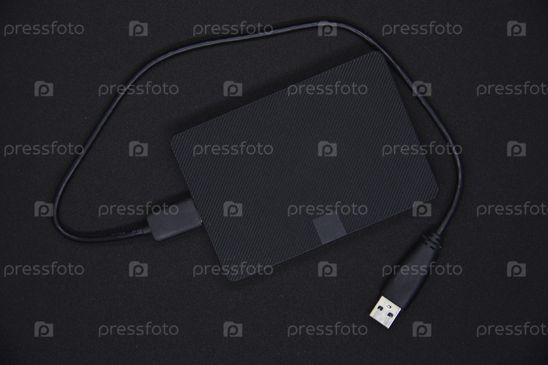 Черный портативный жесткий диск на черном фоне. Хранение информации. Личный гаджет