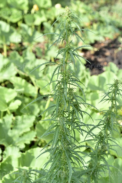 Зеленое растение конопли в саду летом