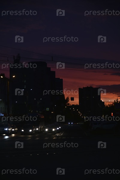 Розовый яркий закат и машины на дороге. Крыши домов и яркий закат