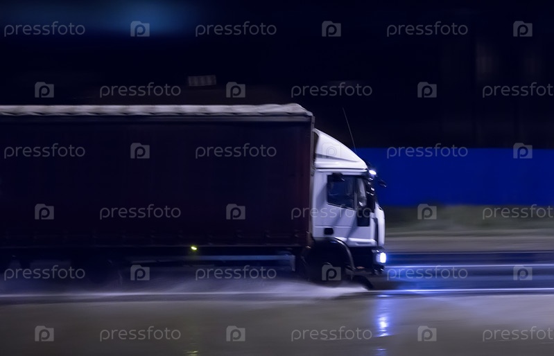 Грузовик движется ночью по мокрой дороге