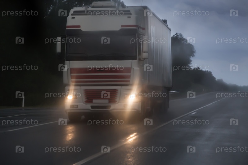 Грузовик движется в дождь и туман