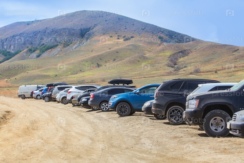 Автомобили на поле возле горы