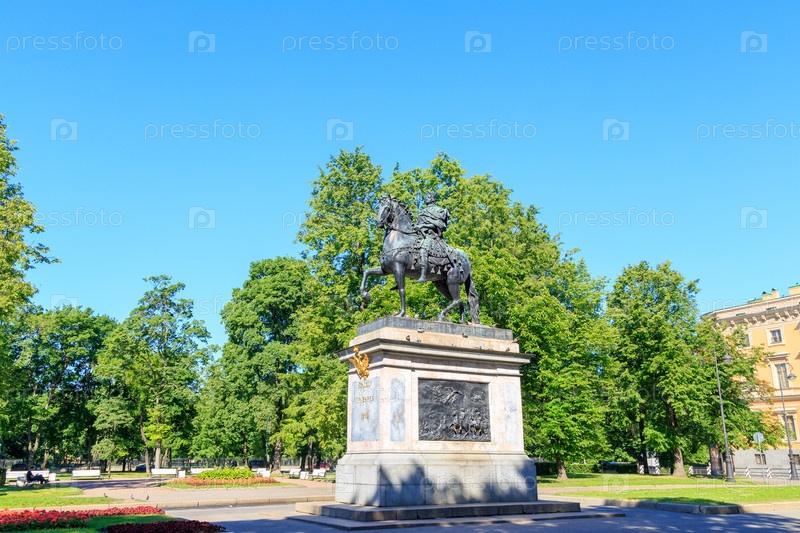 Памятник Петру I на площади Петра Великого.Текст переведен на английский язык: Прадед от правнука 1800 г