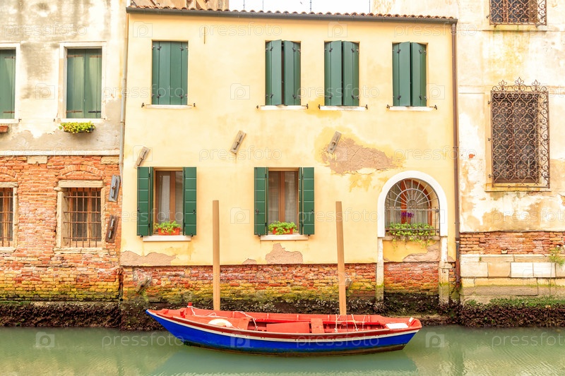Венеция, Италия. Красная лодка с синим днищем на фоне желтого дома с зелеными ставнями. Канал Рио-делла Мизерикордия
