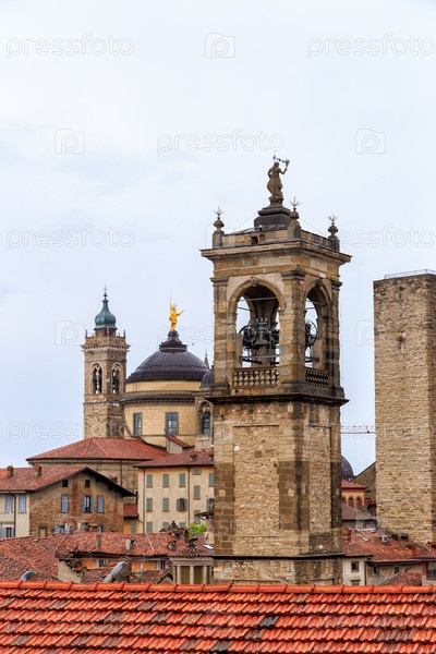 Бергамо, Италия. Крыши домов. Храмы и церкви. Колокольня. Золотая фигура в соборе Бергамо. Историческая часть города. Верхний город. Дождливая погода