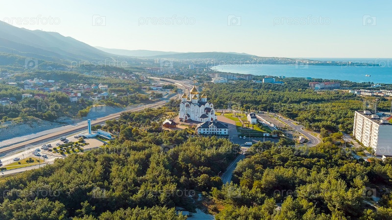 Геленджик, Россия. Собор Андрея Первозванного. Текст по трассе М4-Дон переведен: Слава России, Кубань-Жемчужина России. Геленджик-Городской курорт, вид с воздуха