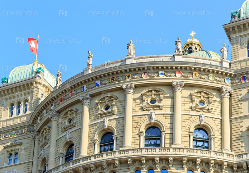 Берн, Швейцария.Bundeshaus - Федеральный дворец.Фасад с официальными гербами регионов