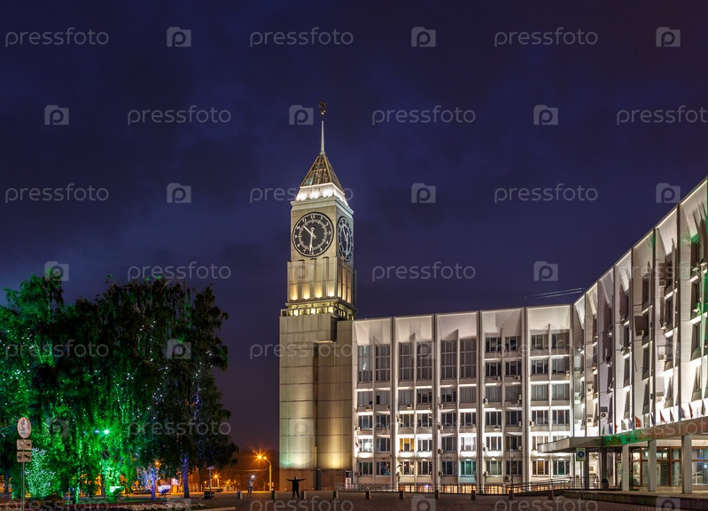 Россия, Красноярск. Ночная съемка. Городская часовая башня Красноярской городской администрации (Красноярский Биг-Бен)