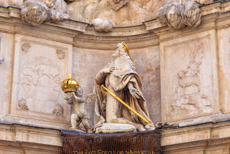 Вене, Австрия. Статуя Леопольда I в молитве. Первая часть молитвы. Чумный столб (Песцауле). Колонна Троицы в стиле барокко, посвященная эпидемии бубонной чумы 1679 года. Установлена в 1693 году